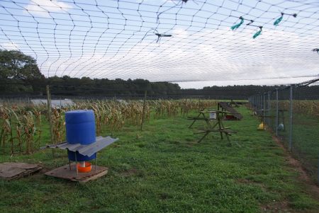 | Große und geräumige Volieren mit grüner Wiese und Maispflanzen | |